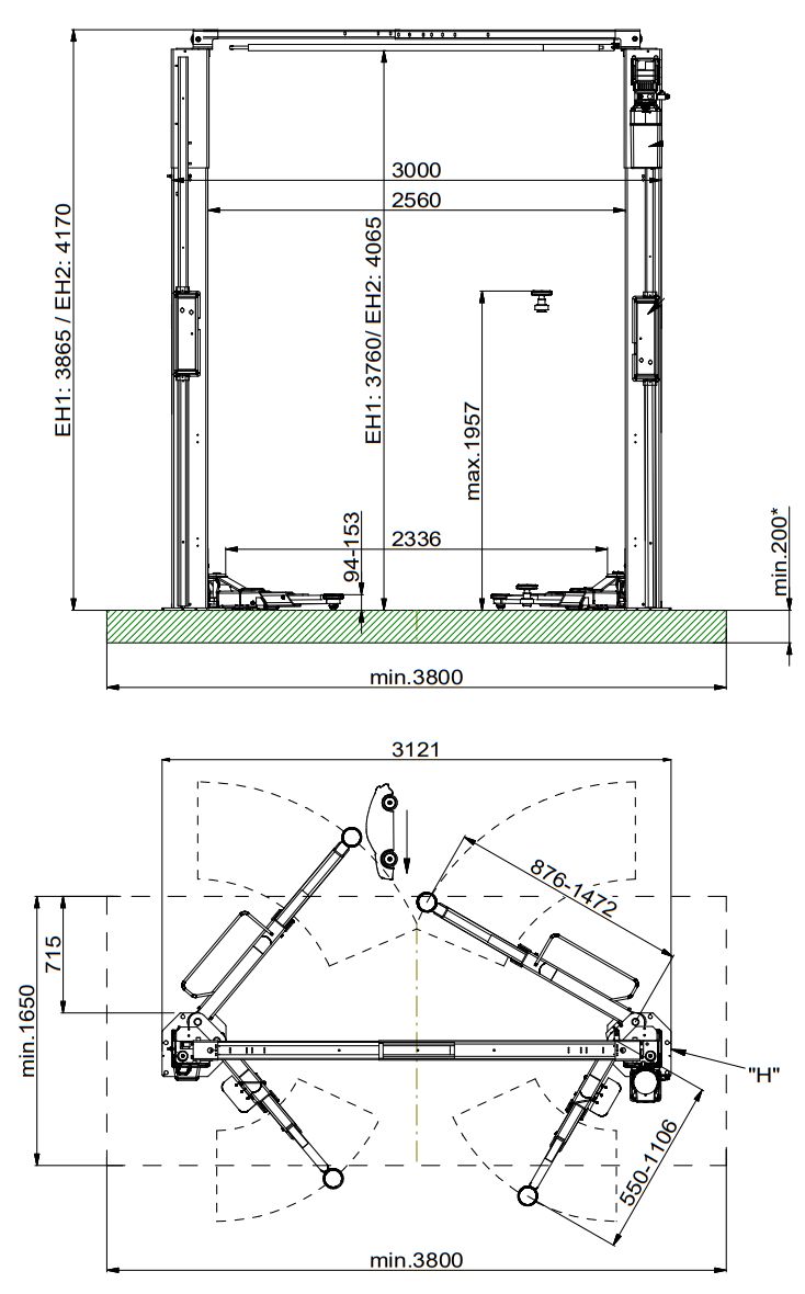 Elektro-hydrauliczny podnośnik 2-kolumnowy bez podstawy (z wolnym przejazdem), z asymetrycznymi rmionami i symetrycznymi kolumnami, które umożliwiają łatwy i swobodny dostęp do punktów podparcia pojazdu.