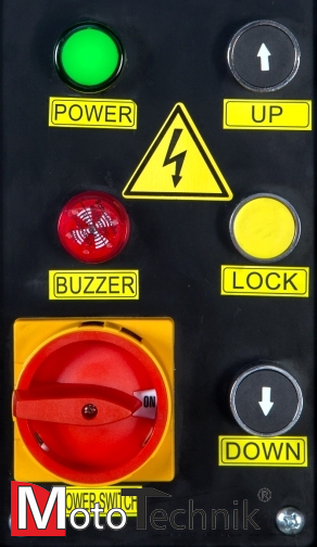 - Pojazd jest opuszczany po prostu przez naciśnięcie przycisku opuszczania. Nie trzeba aktywować przycisku UP, aby zwolnić ramiona z pozycji blokady.