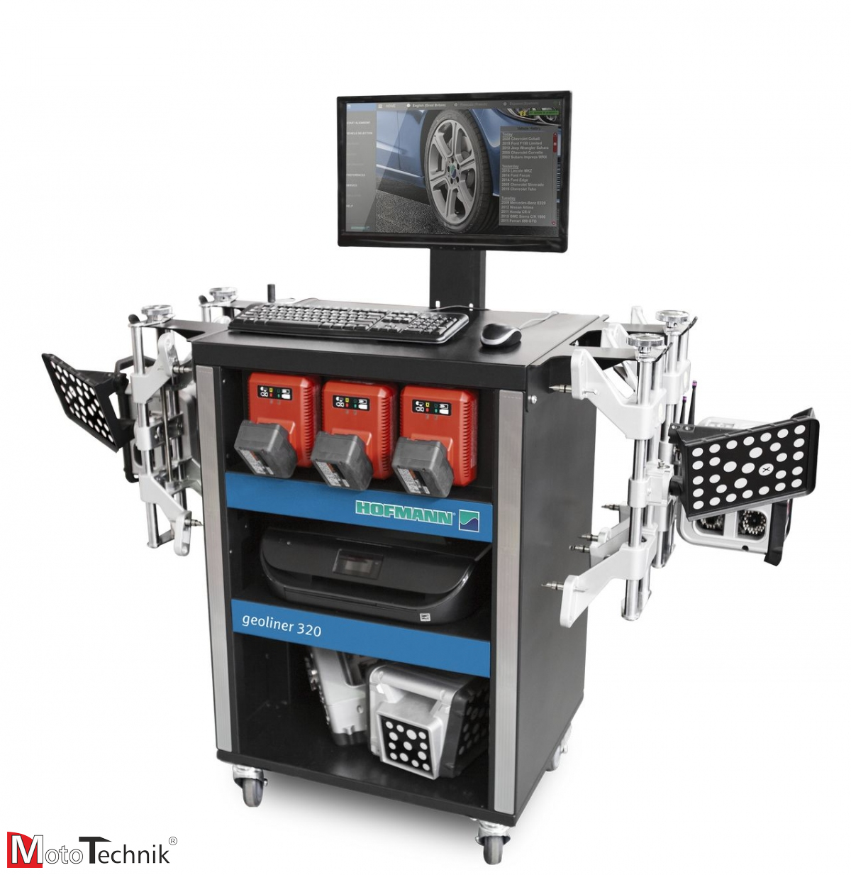 Urządzenie do pomiaru geometrii firmy Hofmann, z oprogramowaniem 320, dokonujące pomiaru w technologii 3D. Dedykowana dla serwisów o krótkim stanowisku pomiarowym, całość zamontowana pomiędzy tylną i przednią osią pojazdu. Geometria wyposażona w monitor LCD TFT 22”, drukarkę i komputer, wszystko w zabudowanej szafce. Wyposażona w targety mocowane do koła przy pomocy uchwytów AC700 w zakresie średnicy felgi od 11-22’’.