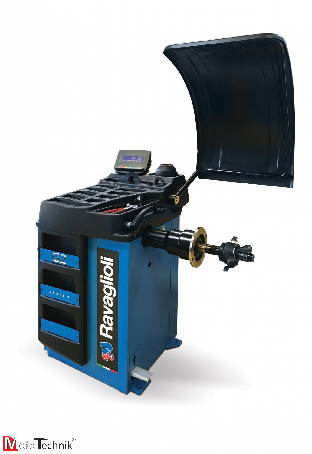 Wyważarka Ravaglioli G2.124NR to nowy kompaktowy model nisko-obrotowego podstawowego urządzenia do wyważania kół samochodów osobowych i dostawczych oraz motocyklowych (z opcjonalną przystawką)