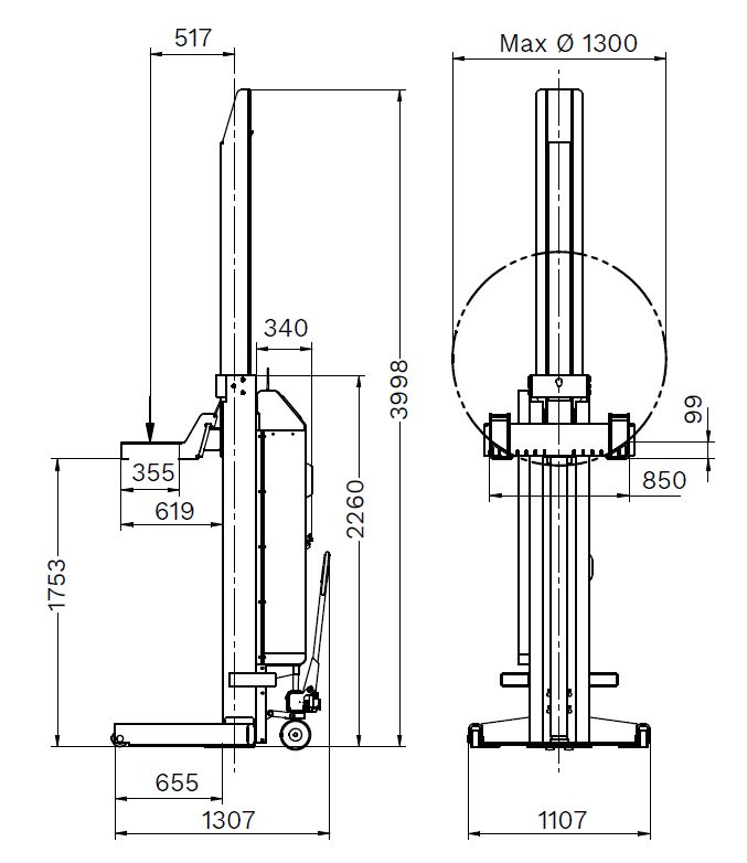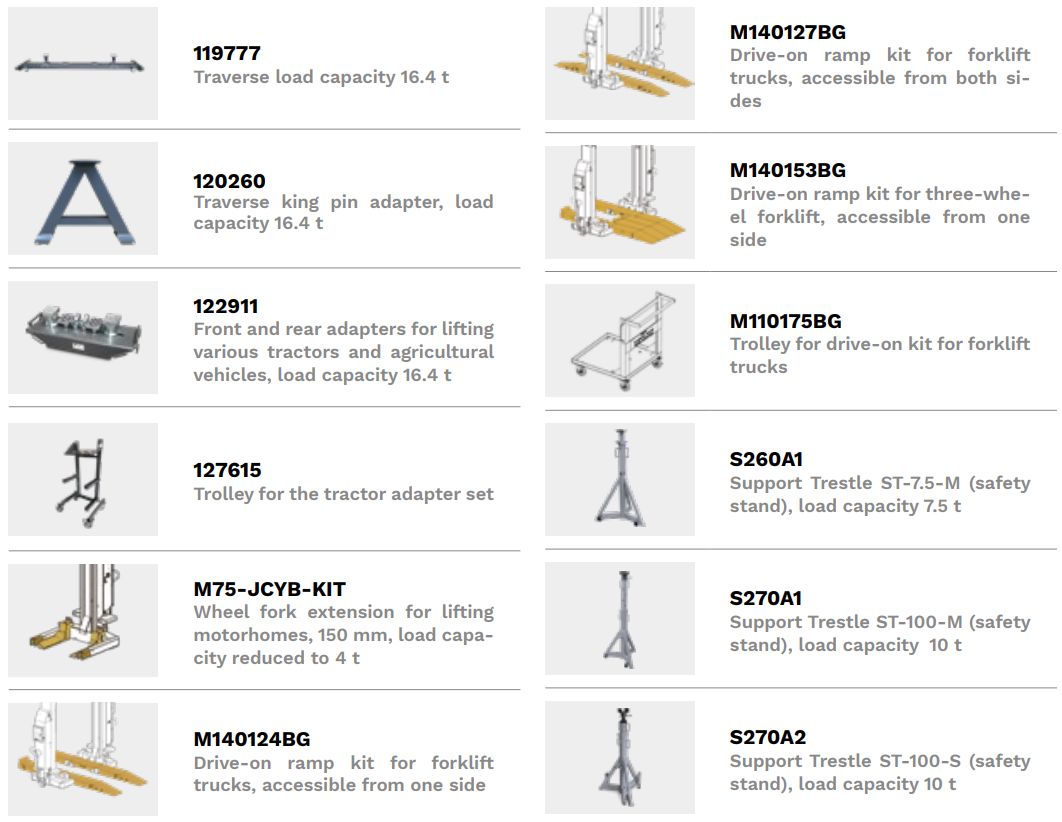 Typ napędu elektrohydrauliczny Komunikacja kolumn bezprzewodowy Liczba jednostek podnoszących 4 Udźwig zestawu 30 000 kg Udźwig na jedną kolumnę 7500 kg Wysokośc podnoszenia 1753 mm Czas podnoszenia z obciążeniem 65 sekund Czas obniżania 54 sekundy Cykle podnoszenia przy pełnym obciążeniu 14 Średnica koła min. 570 mm Maksymalna średnica koła. 1300 mm Moc napędowa na jednostkę podnoszenia 3 kW Waga na jednostkę podnoszenia 640 kg Powłoka powierzchniowa Malowane proszkowo Połączenie elektryczne 230 V | 50 - 60 Hz Szerokość 1107 mm głębokość 1307 mm Wysokość 2260 mm Waga 2560 kg Długość opakowania 1500 mm Szerokość opakowania 1500 mm Wysokość opakowania 4500 mm Masa całkowita 2560 kg