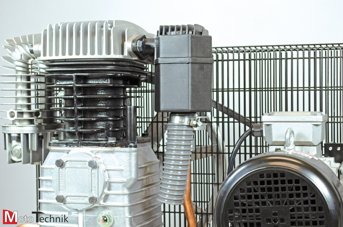 - 2-stopniowa pompa z żeliwnym cylindrem, wyposażona w duże kolektory do chłodzenia sprężonego powietrza na wlocie do zbiornika.
