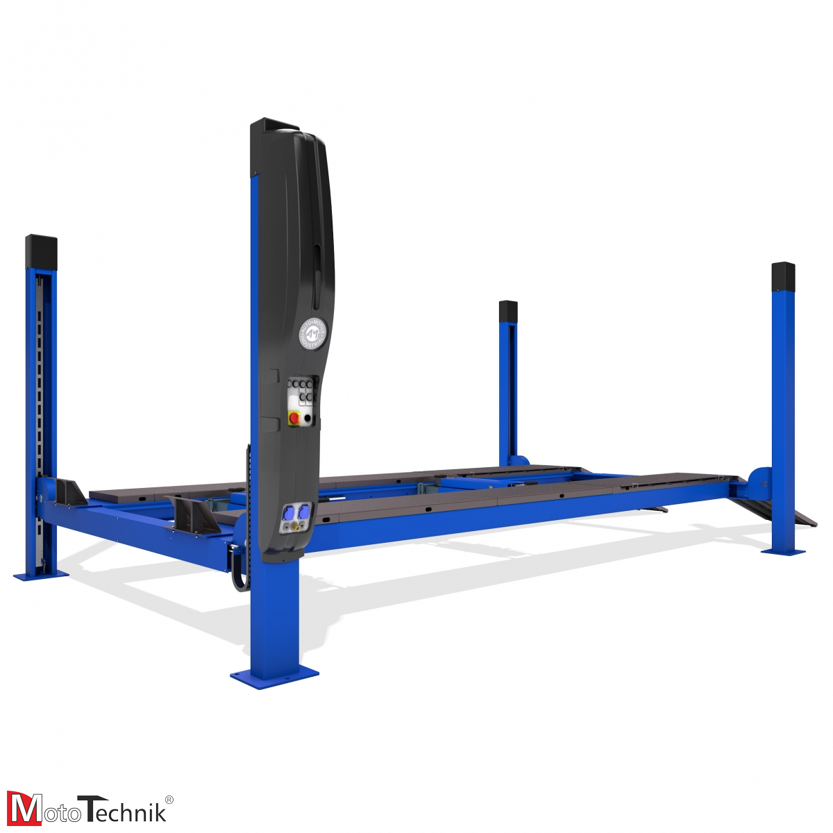 Podnośnik 4-kolumnowy diagnostyczny AMI 4,0 N-WAY przeznaczony do obsługi samochodów osobowych i dostawczych, przygotowany do ustawianie geometrii pojazdów o masie do 4000 kg, idealny do warsztatów o małej przestrzeni.