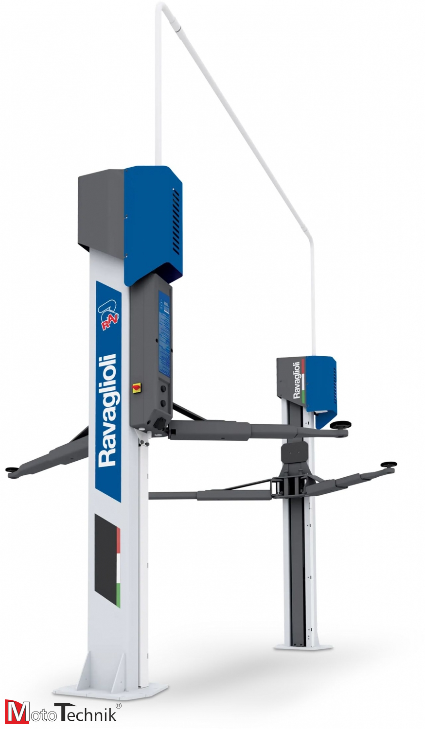 Dwukolumnowy podnośnik śrubowy, elektromechaniczny RAVAGLIOLI KPX42 AV (nowa konstrukcja ramion) przeznaczony do podejmowania pojazdów osobowych, SUV, terenowych i dostawczych o masie do 4000 kg.