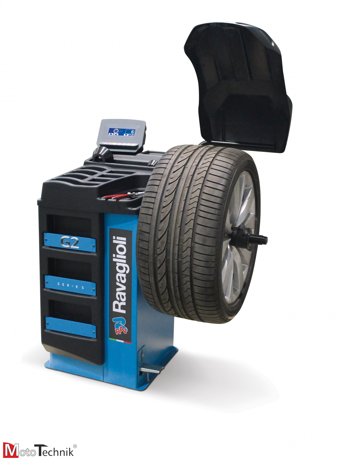 Wyważarka Ravaglioli G2.121RFM to nowy kompaktowy model nisko-obrotowego podstawowego urządzenia do wyważania kół samochodów osobowych i dostawczych oraz motocyklowych (z opcjonalną przystawką)